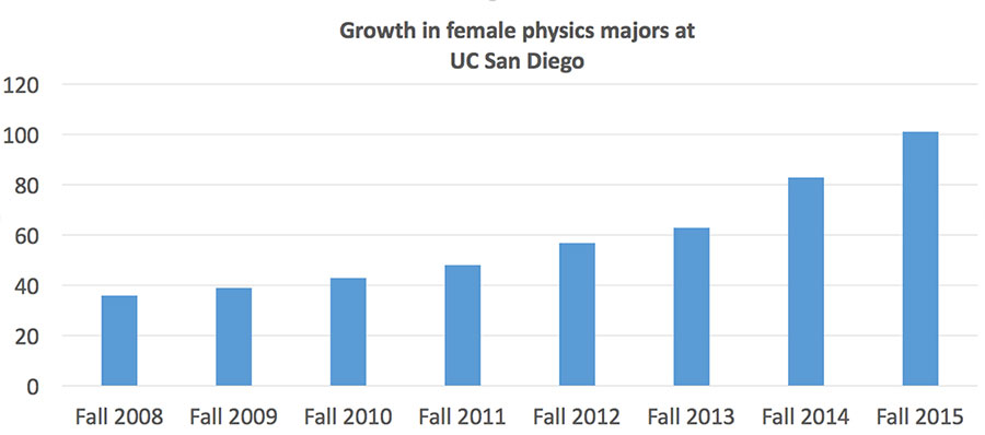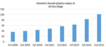 Grinstein pointed out that the number of female physics majors on the campus has steadily grown, nearly tripling in just the past eight years—from 36 students in 2008 to 101 students in the 2015 fall quarter. That trend, he said, underlines the importance of having visible role models and mentors among the faculty for women hoping to pursue advanced degrees and careers in physics and astronomy.