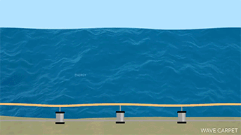 Placed below the water’s surface near the seafloor, the carpet adopts the wave motion of the ocean, moving the attached pumps to produce hydraulic pressure that is then piped onshore and converted into power.