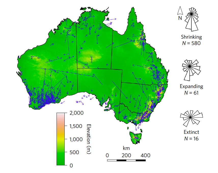 The study projects that within the next 60 years, the ranges of the vast majority of species (91 percent) across Australia will shrink in size by roughly half on average, and suitable habitat will tend to shift south and to higher elevations. For 16 species in the study, suitable habitat will disappear altogether.