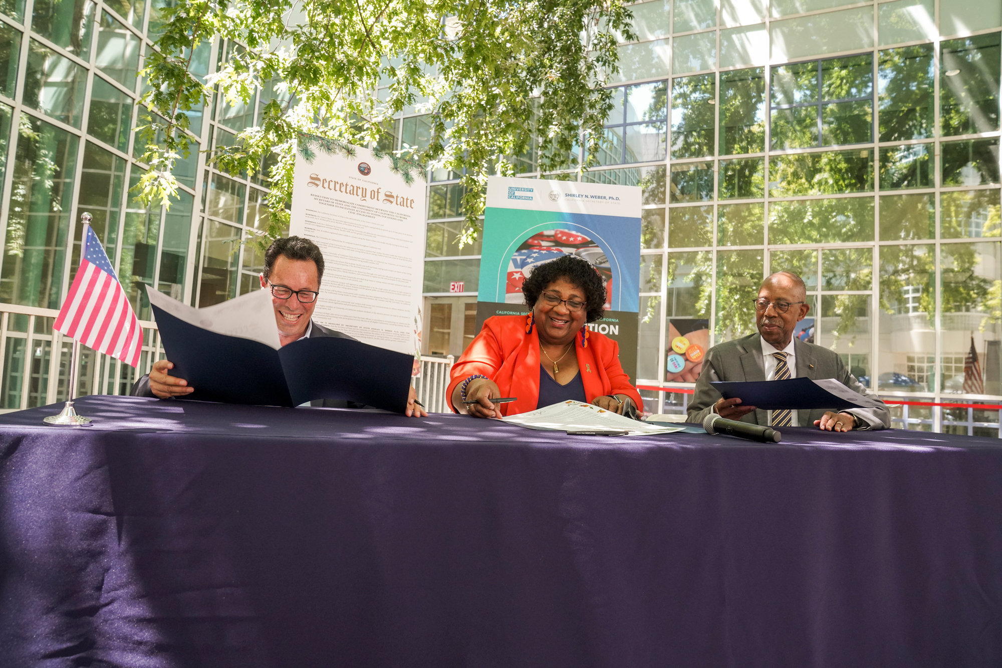 Read our press release here: UC President Drake, Board of Regents Vice Chair Leib sign resolution with California Secretary of State Weber to affirm partnership aimed at increasing student participation in elections