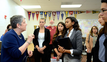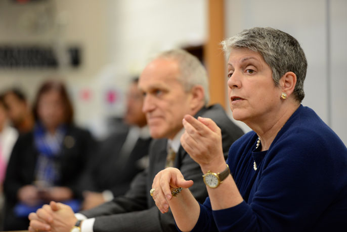 University of California President Janet Napolitano and UC Riverside Chancellor Kim A. Wilcox made two appearances in the Inland Empire Thursday (April 14), discussing the value of a college education and highlighting the affordability and accessibility of UC for California students and their families. The visits to Eleanor Roosevelt High School in Eastvale and Chaffey College in Rancho Cucamonga are part of a statewide effort by UC to boost the enrollment of Californians by 5,000 in fall 2016 and another 5,000 by 2018.