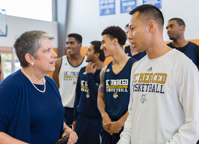 After lunch, Napolitano caught up with the UC Merced men’s basketball team and applauded them for their hard work on and off the court. On behalf of the team, coach Kevin Pham presented the president — an avid fan of the sport — with a team jersey.