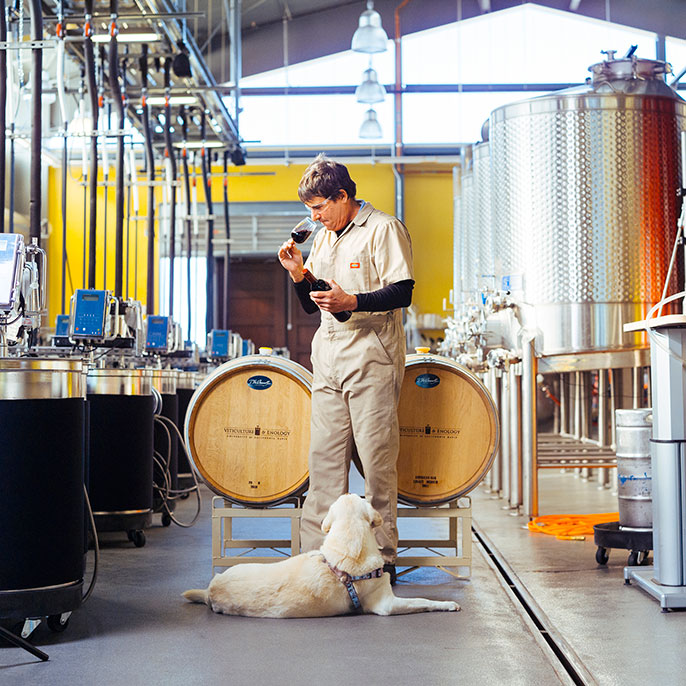 Overall Sustainable Design: The Jess S. Jackson Sustainable Winery Building at UC Davis is a research facility designed to utilize sunlight and natural air to minimize energy use. It is heated and cooled by passive strategies that include nighttime ventilation and an underground thermal rock bed. Solar power, energy efficient lighting and daylight keep rooms lit. Its water system treats and reuses wastewater, and harvests rainwater to achieve near-net zero water use.