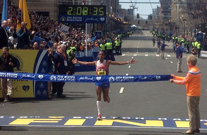 Keflezighi ran the 26.2-mile race in 2:08:37, bringing joy to a city and community of runners a year after a bombing at the finish line killed three people. According to the Boston Globe, Keflezighi wore the names of those killed on his running bib, along with the name of the MIT police officer killed during a shootout in the investigation that followed.