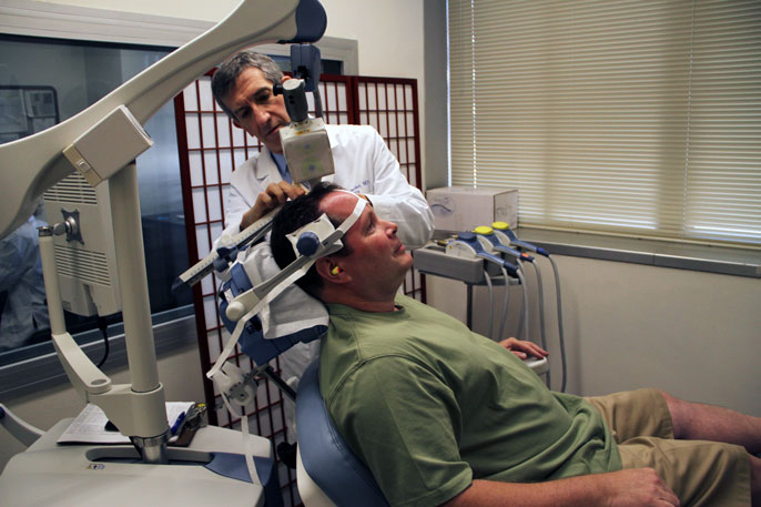 During TMS therapy, the patient sits in a reclining chair, much like one used in a dentist’s office, and a technician places a magnetic stimulator against the patient’s head in a predetermined location, based on calibrations from brain imaging.