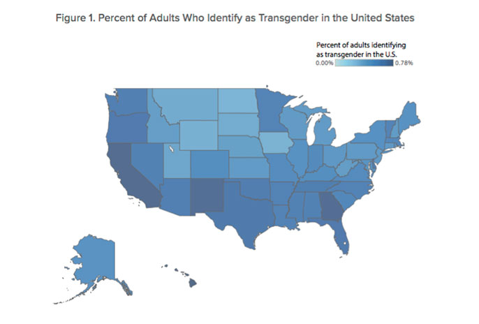 An estimated 0.6 percent of adults in the United States, or 1.4 million individuals, identify as transgender, according to a new study authored by researchers at The Williams Institute at the UCLA School of Law. The study provides the first ever state-level estimates of the percentage of adults who identify as transgender throughout the United States, ranging from 0.3 percent in North Dakota to 0.8 percent in Hawaii.