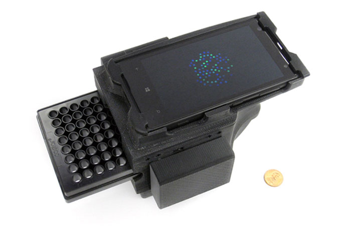 To adapt a cellphone to detect the light produced from dyes associated with amplified DNA while those samples are in standard laboratory containers, such as well plates, the team developed a cost-effective, field-portable fiber optic bundle. The fibers in the bundle routed the signal from each well in the plate to a unique location of the camera sensor area. This handheld reader is able to provide comparable results to standard benchtop readers, but at a fraction of the cost, which the authors suggest is a promising sign that the reader could be applied to other fluorescence-based diagnostic tests.