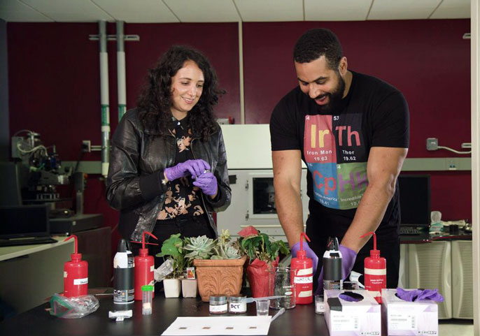 Urschel also meets with materials scientist Rita Blaik, who co-leads CNSI’s education program with Sarah Tolbert, a professor of chemistry and biochemistry. Blaik demonstrates some of the science behind the Wasp’s suit, which is highly water-repellent, or superhydrophobic.
