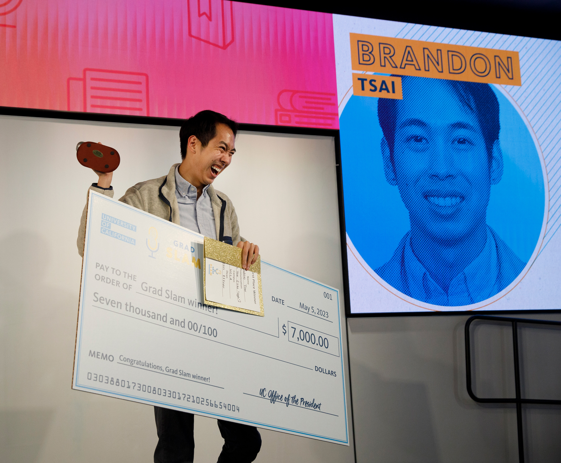 Brandon Tsai, right, stands next to Grad Slam emcee and UC President Michael V. Drake, M.D., who helps him hold his giant winning check.