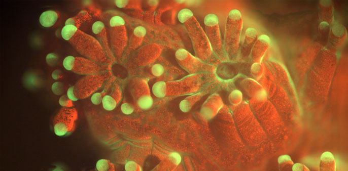 The polyp communities that share connective tissue work together to ward off predators. They’re not hostile to other colonies of their own species. But when confronted with foreigners, or when aiming to expand their territory, they can extrude their digestive organs and rub a digestive enzyme all over the bodies of their enemies, as seen in the videos. We hypothesize, as others have, that some set of chemicals they emit mediates the corals' awareness of each other.