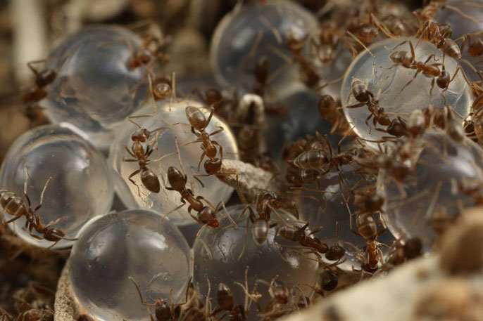 The hydrogels are designed to be slow-acting, so it takes several days before the ants die. By that time tens of thousands will have ingested the liquid bait.