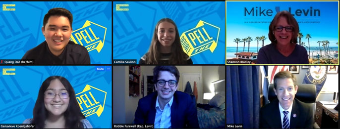 Genavieve: My proudest moment in the program was seeing the virtual Capitol Hill Day in support of the Double the Pell campaign come to fruition, especially when my team and I got to meet our federal representative, Congressman Mike Levin. The Hill Day was a massive undertaking in which student ambassadors from all the campuses had the opportunity to meet with the staff of their congressional representatives to build support for doubling the maximum award of the federal Pell Grant. The other campus leaders and I were charged with contacting the offices of congressional representatives, and I was fortunate enough to land a meeting with the congressman himself! Congressman Levin was very friendly and listened attentively to our asks and opinions, which was extremely validating for myself and my team. The experience showed me that my advocacy was not going unnoticed and that we as young people really could push for meaningful change and be successful.