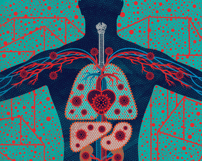 True to its name, SARS-CoV-2 (which stands for severe acute respiratory syndrome coronavirus 2) is first and foremost a bad respiratory virus. If your immune system doesn’t defeat it at its landing site in your nose or throat, it will advance down your windpipe, infiltrating the cells lining your lungs’ branching air tubes. At the tubes’ ends, tiny air sacs called alveoli pass oxygen to your blood. As the virus multiplies, the alveoli may fill with fluid, shutting down this critical gas exchange. Your blood-oxygen level may drop and, typically about six days into an infection, you may start feeling short of breath.