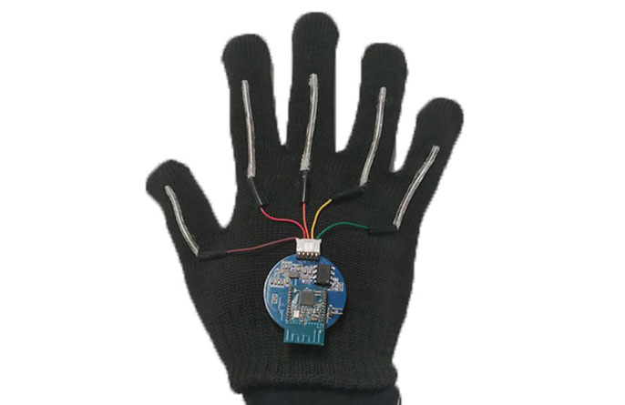The system includes a pair of gloves with thin, stretchable sensors that run the length of each of the five fingers. These sensors, made from electrically conducting yarns, pick up hand motions and finger placements that stand for individual letters, numbers, words and phrases.