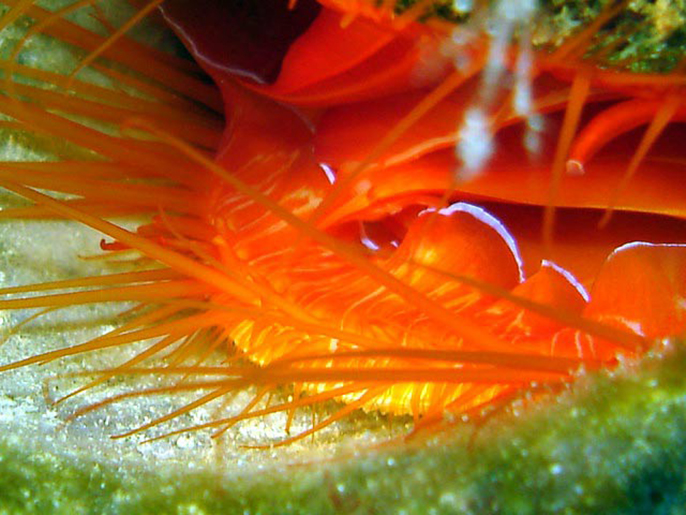 By repeatedly unfurling and furling the lip, the clam produces a continual rippling light show. The non-reflective back of the lip strongly absorbs blue light, so it appears dark and makes the contrast between the sides even more striking.
