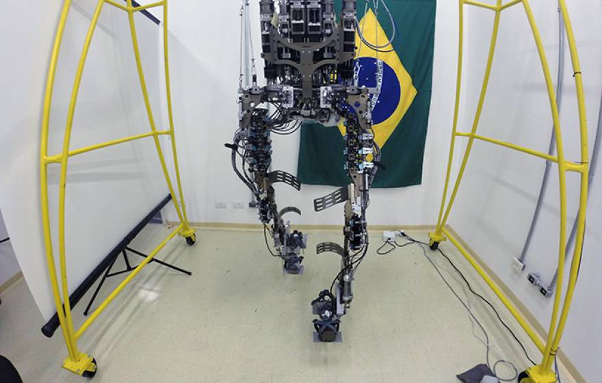 A paraplegic with the help of robotic exoskeleton will kick a ball during the opening ceremony of soccer tournament.