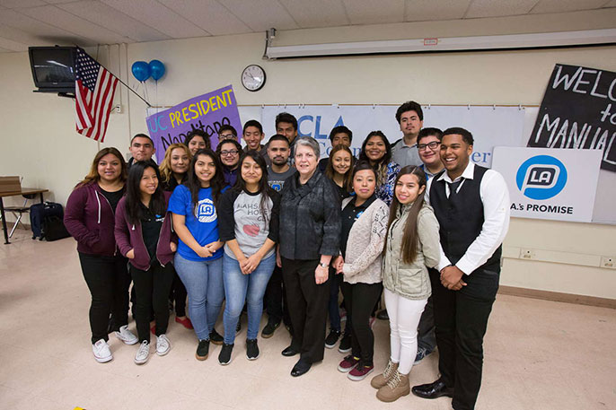 University of California President Janet Napolitano visited Manual Arts High School in Los Angeles today (Feb. 4) to speak with parents, students, teachers and counselors as part of a concentrated effort to raise awareness of UC’s accessibility and affordability. Managed by the nonprofit LA’s Promise, Manual Arts aims to prepare students for college and future careers, while providing a solid education.